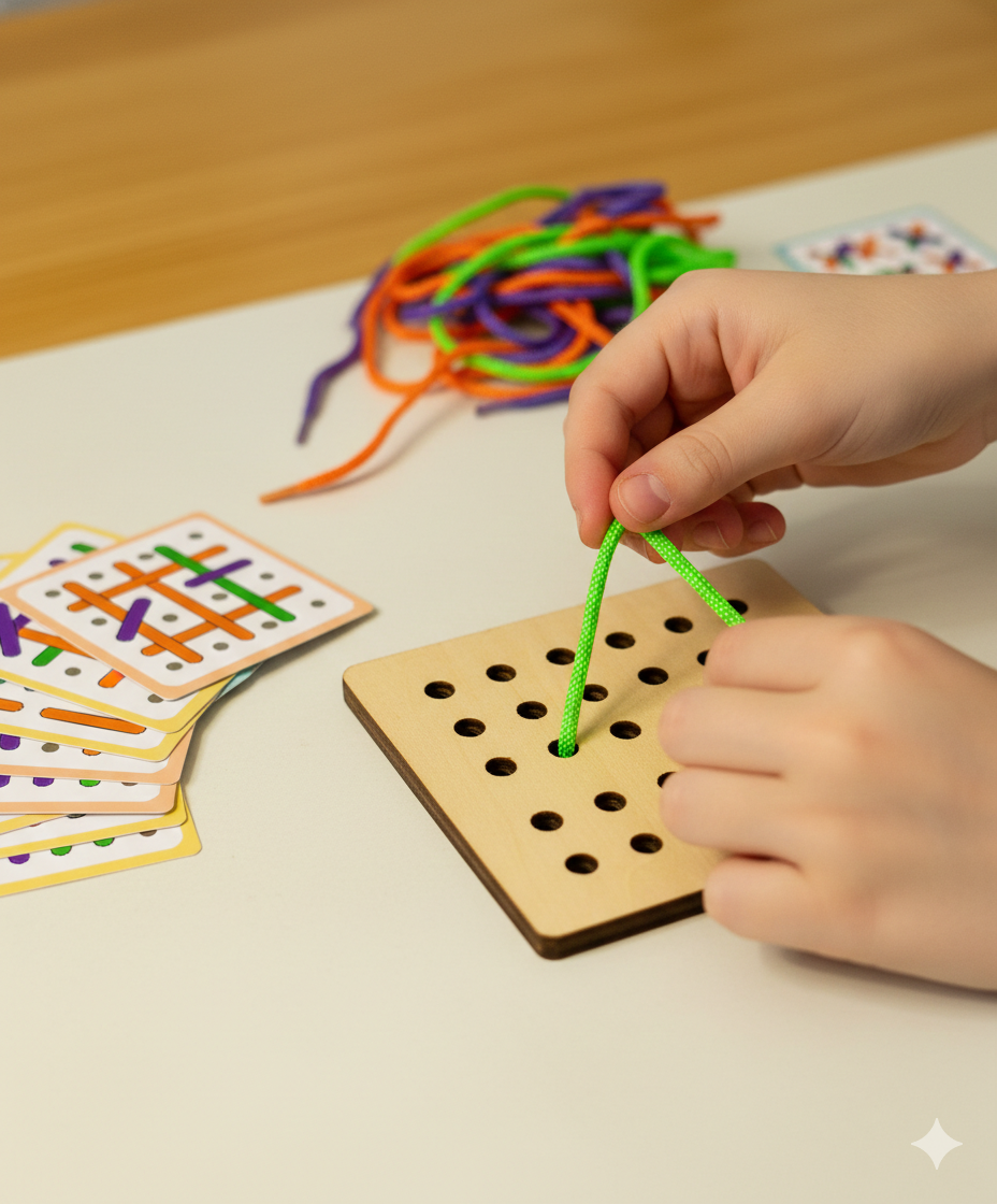- This Fun Threading Game Not Only Provides Entertainment But Also Helps Develop Fine Motor Skills In Children As They Thread The Rope Through The Holes On The Board Following Different Patterns Provided On The Cards